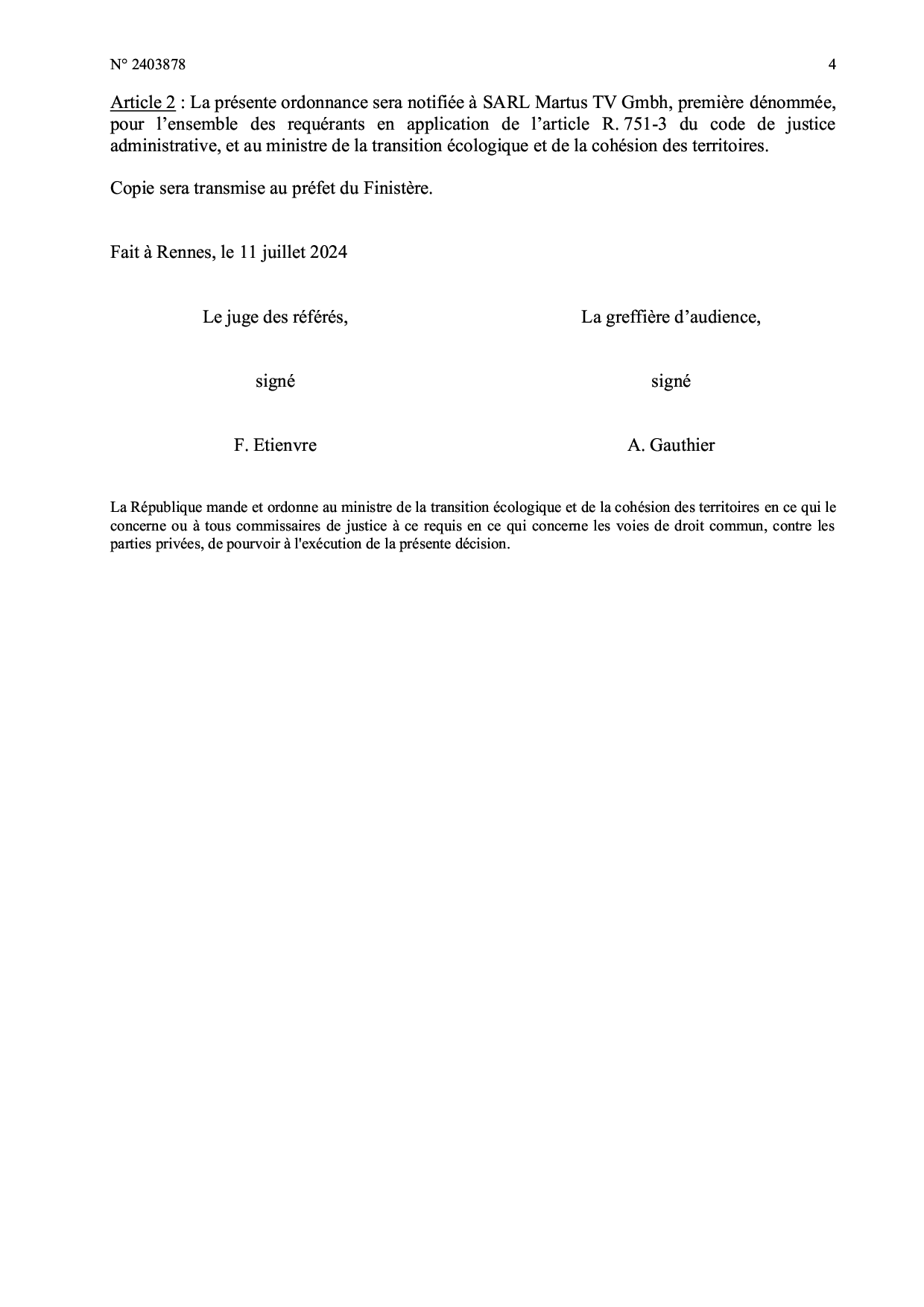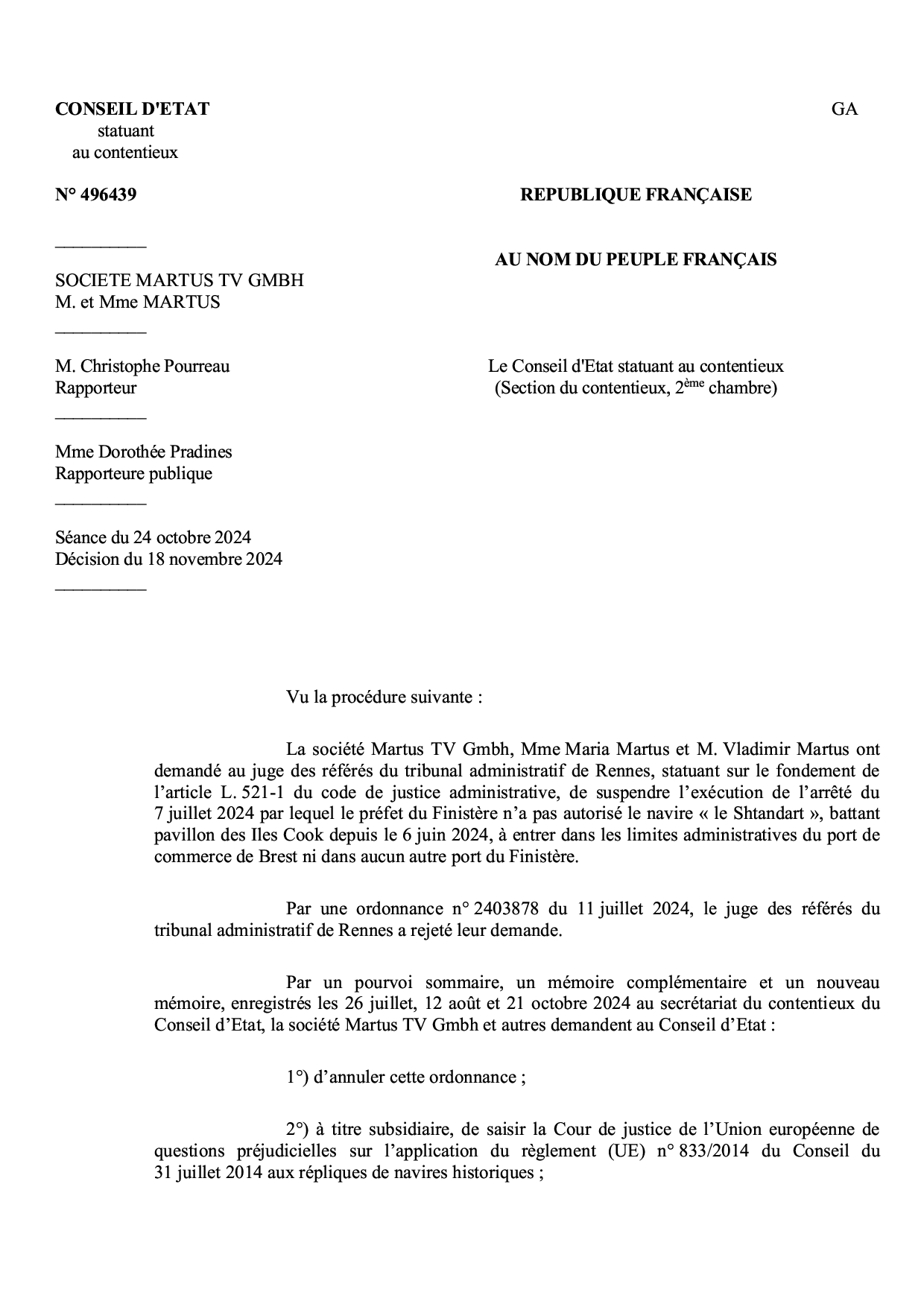 - A2 – Tribunal administratif de Rennes : ordonnance déboutant le Shtandart et son avocat, Thierry Clerc, 11 juillet 2024