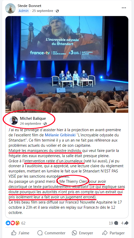 Dans la discussion qui suit cette publication, il est intéressant de lire le président de l’association « Amis des Grands Voiliers», Michel Balique, un des lobbyistes clef du Shtandart. Il expose, quasiment mot pour mot, l’argumentaire qui sera développé par Thierry Clerc dans la mise en demeure servant de prologue à la procédure-bâillon que Vladimir Martus envisage de lancer contre le collectif « No Shtandart In Europe ».