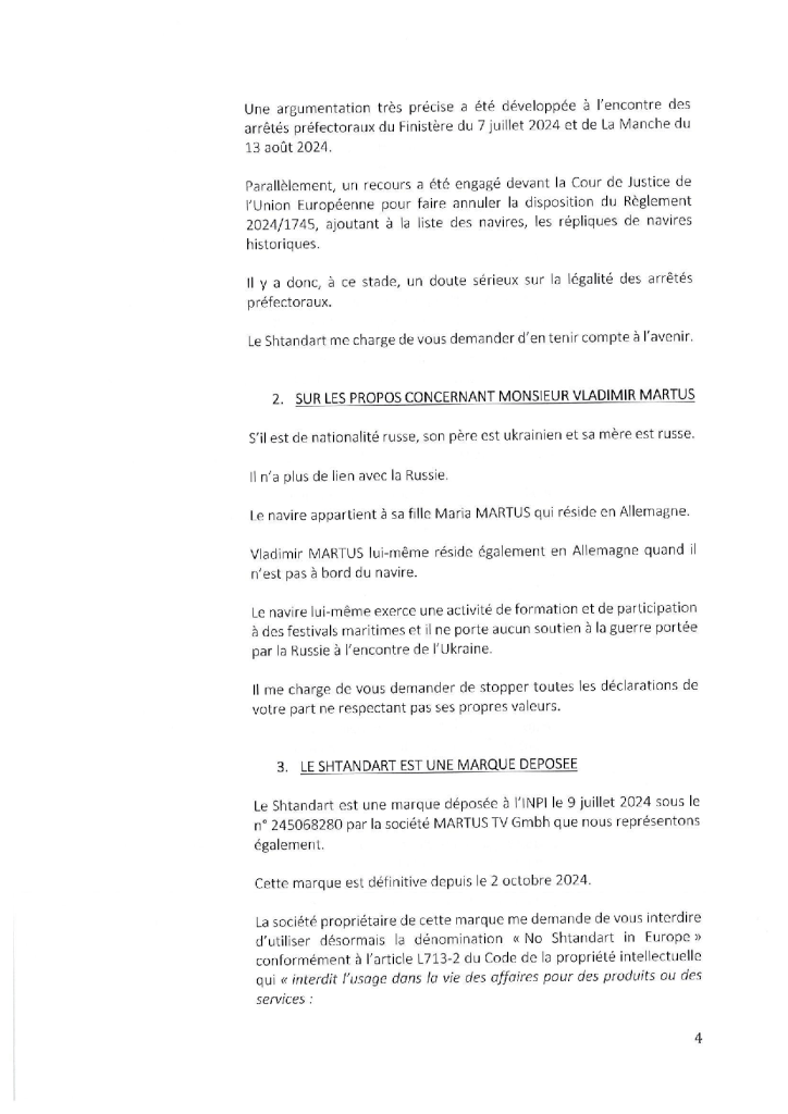 A4 – Courrier de mise en demeure reçu de Me Clerc pour le compte du « Shtandart», 31 octobre 2024