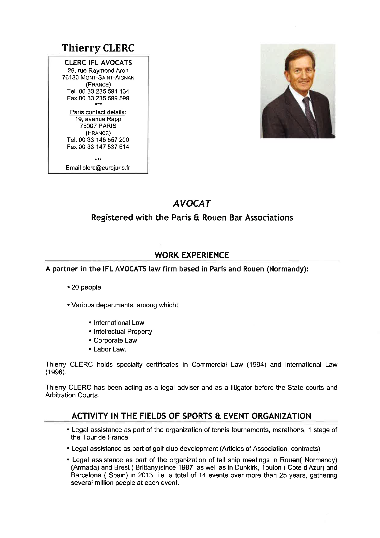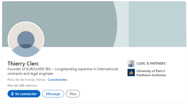 Sur sa page Linkedin en anglais, , le 16/11/2024, Thierry Clerc est fondateur de l’International Business Group (IBG) d’« Eurojuris » et propriétaire du cabinet “Clerc & Partners”.