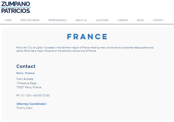 « Zumpano Patricios » déclare que son bureau satellite, à Paris, est « Clerc Avocats », 19 avenue Rapp.