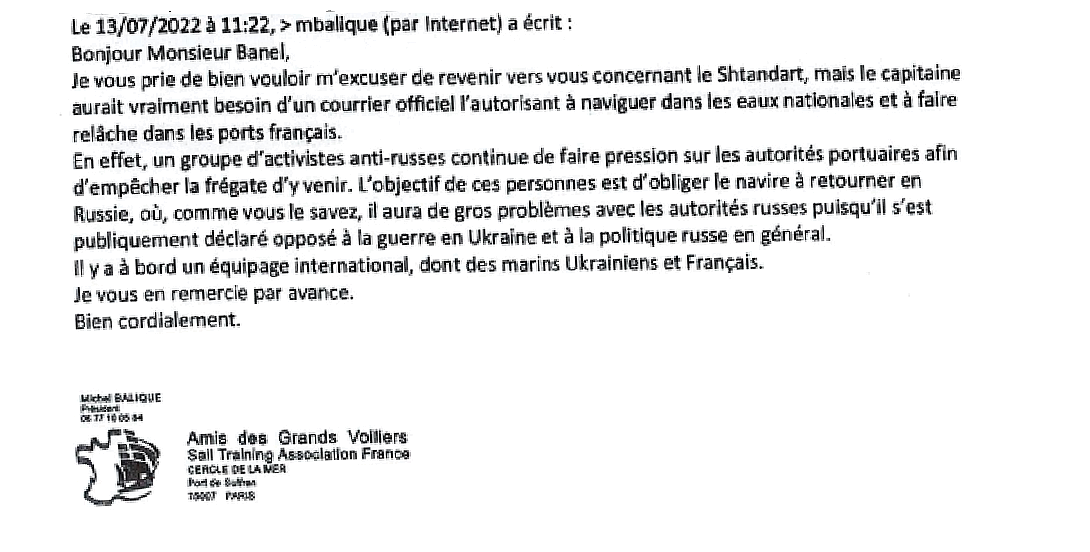 Ce courriel répond à un email de Michel Balique, président de l’association “Amis des Grands Voiliers”, principal lobbyiste et commercial du Shtandart.