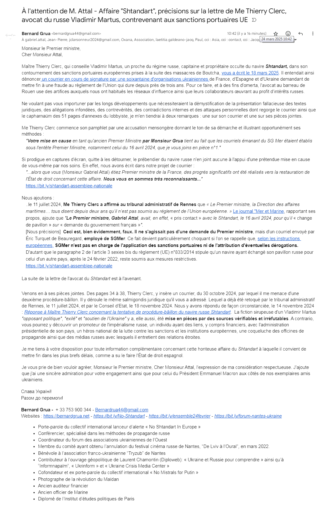 Maître Thierry Clerc, qui conseille Vladimir Martus, un proche du régime russe, capitaine et propriétaire occulte du navire Shtandart, dans son contournement des sanctions portuaires européennes prises à la suite des massacres de Boutcha, vous a écrit le 18 mars 2025. Il entendait ainsi dénoncer un courrier en cours de signature par une soixantaine d’organisations ukrainiennes de France, d’Espagne et d’Ukraine demandant de mettre fin à une fraude au règlement de l’Union qui dure depuis près de trois ans. Pour ce faire, et à des fins d’omerta, l’avocat au barreau de Rouen use des artifices auxquels nous ont habitués les réseaux d’influence ainsi que leurs collaborateurs œuvrant au profit d’intérêts russes.