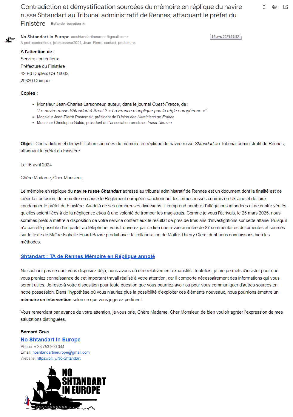 Le mémoire en réplique du navire russe Shtandart adressé au tribunal administratif de Rennes est un document dont la finalité est de créer la confusion, de remettre en cause le Règlement européen sanctionnant les crimes russes commis en Ukraine et de faire condamner le préfet du Finistère. Au-delà de ses nombreuses diversions, il comprend nombre d’allégations infondées et de contre vérités, qu’elles soient liées à de la négligence et/ou à une volonté de tromper les magistrats. Comme je vous l’écrivais, le 25 mars 2025, nous sommes prêts à mettre à disposition de votre service contentieux le résultat de près de trois ans d’investigations sur cette affaire. Puisqu’il n’a pas été possible d’en parler au téléphone, vous trouverez par ce lien une revue annotée de 87 commentaires documentés et sourcés sur le texte de Maître Isabelle Enard-Bazire produit avec la collaboration de Maître Thierry Clerc, dont nous connaissons bien les méthodes.