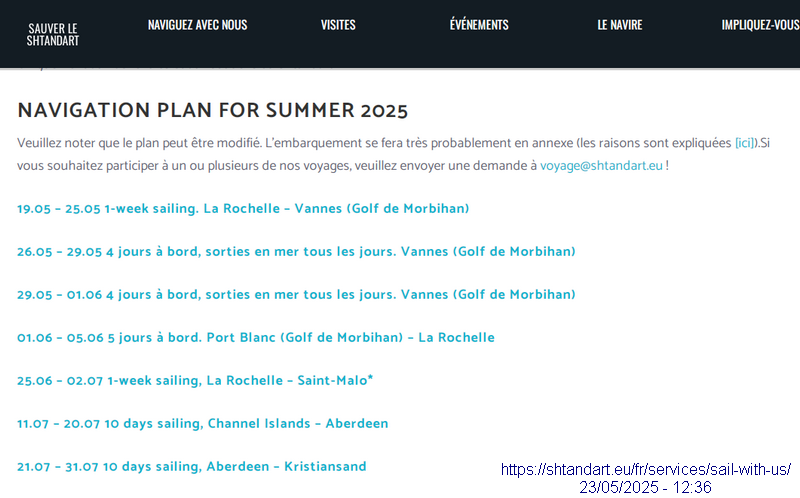 - Ukrinform, 05/05/2025 – Le trois-mâts russe « Shtandart » n’a pas pu accoster au port du Havre ↩︎