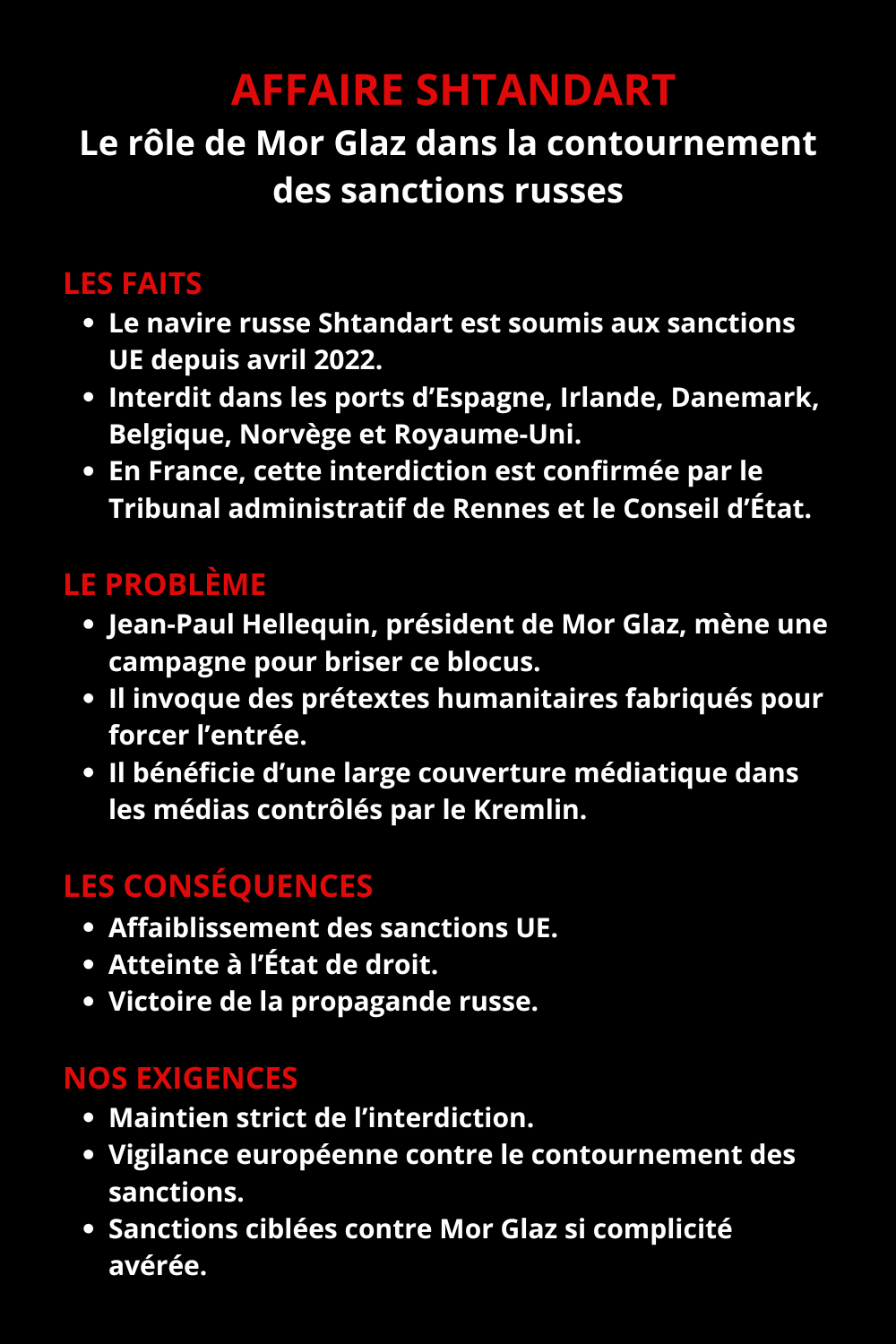 Mor Glaz agit en complicité avec Vladimir Martus, connu pour ses liens étroits avec des réseaux de propagande russe. Cette alliance n’est pas neutre : elle vise à présenter le Shtandart et son équipage comme des victimes injustement sanctionnées, masquant ainsi une stratégie politique de contournement des mesures européennes. La félicitation publique adressée au préfet de Charente-Maritime pour avoir autorisé une escale interdite illustre clairement cette connivence.
