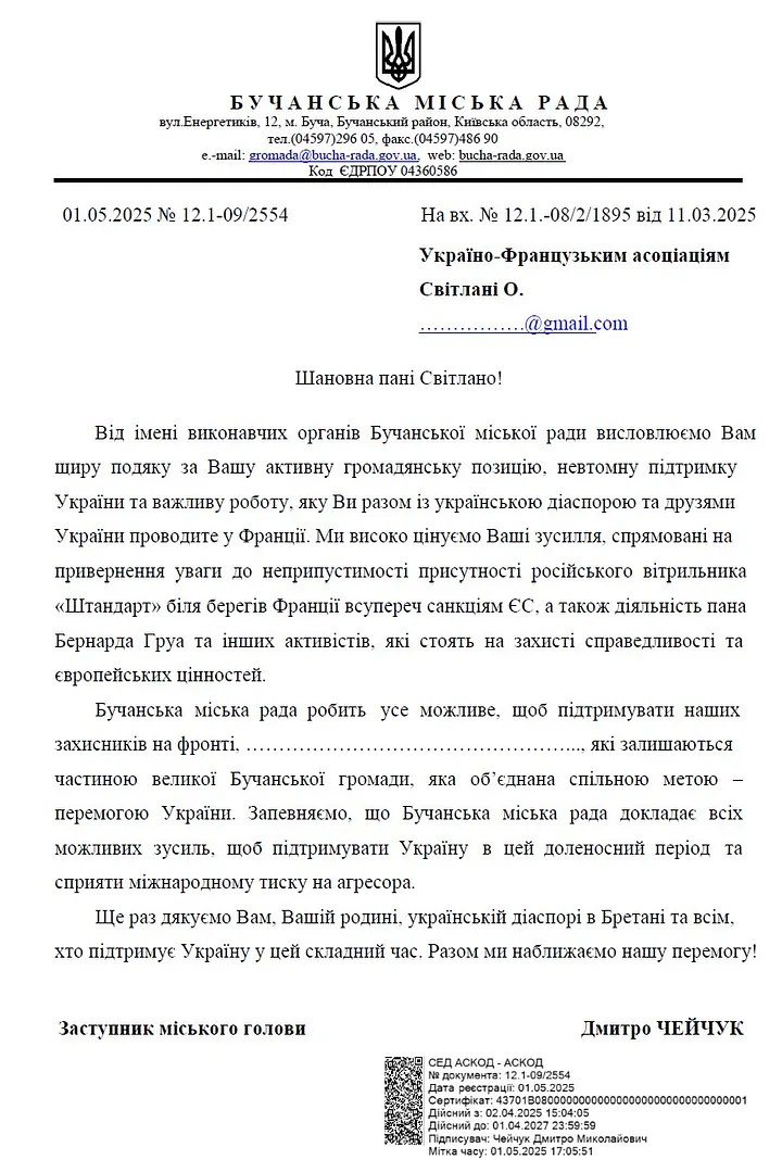 À l’attention de : Monsieur Olivier Falorni, député de la 1re circonscription de Charente-Maritime Monsieur Laurent Mazaury, député de la 11e circonscription des Yvelines Monsieur Alain Godet, citoyen français soutenant l’Ukraine