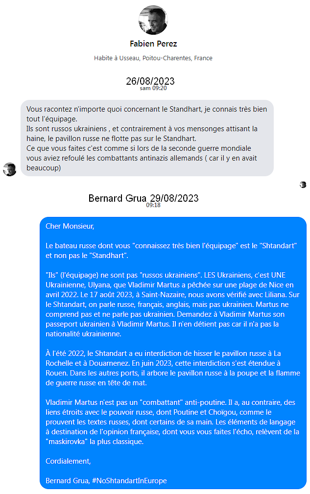 De notre côté, il ressort de notre visite du 17 août 2023, à Saint-Nazaire, qu’à bord du Shtandart, on parle russe, anglais français mais pas ukrainien. Notre activiste Liliana témoigne que Vladimir Martus ne comprend pas l’ukrainien et est incapable de s’exprimer dans cette langue.