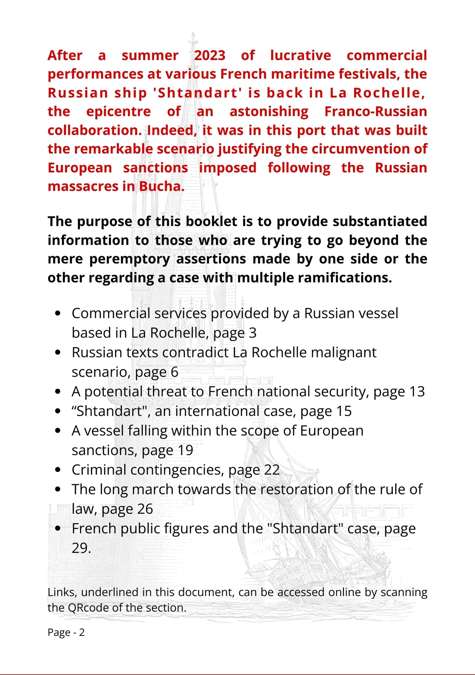 Similarly, as mentioned at the beginning of this brochure, the #NoShtandartInEurope collective posted on line Russian documents evidencing the fictional nature of the Vladimir Martus hoax. We must not rule out the possibility that they will soon be exploited by investigative journalists. This will put an end to the fable of the « Shtandart », « Putin’s opponent », « stateless ship », « Russian-Ukrainian ship », « dissident », « charity organisation », « victim of the Russian war in the same way as Ukrainians », « supporter of Ukraine », and so on. All these assertions, although not valid as derogations, distracted public opinion from a remarkably sophisticated sanctions fraud scheme.