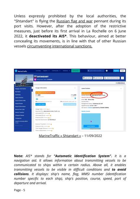 Unless expressly prohibited by the local authorities, the « Shtandart » is flying the Russian flag and war pennant during its port visits. However, after the adoption of the restrictive measures, just before its first arrival in La Rochelle on 06/06/2022, it deactivated its AIS*. This behaviour, aimed at better concealing its movements, is in line with that of other Russian vessels circumventing international sanctions.