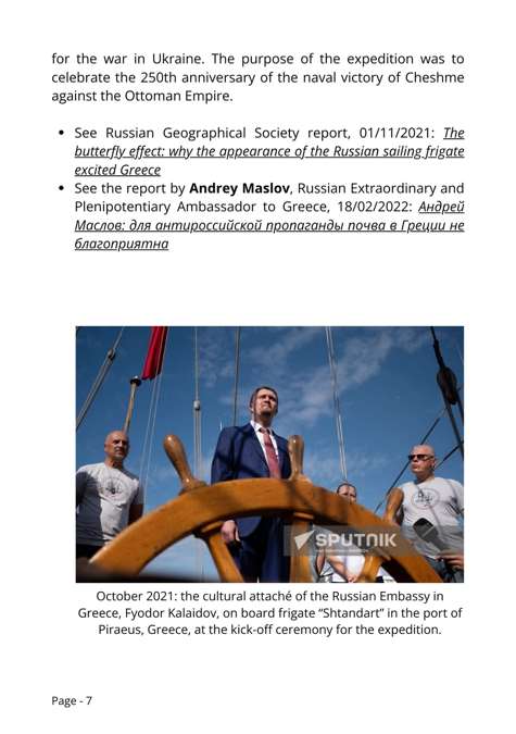 2) Less than six months before the start of the full-scale invasion of Ukraine, as the sound of Russian boots became deafening, in October 2021, the ‘Shtandart’ carried out a very official mission to represent the Russian Federation in the Aegean Sea on behalf of the Russian Geographical Society, under the direction of Sergei Shoigu, the minister responsible for the war in Ukraine. The purpose of the expedition was to celebrate the 250th anniversary of the naval victory of Cheshme against the Ottoman Empire.