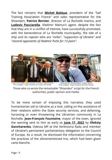 The fact remains that Michel Balique, president of the « Sail Training Association France » and sales representative for the Shtandart, Patrice Bernier, director of La Rochelle marina, and Ludovic Pacciarella, Vladimir Martus’s agent, despite the fact that they are in a conflict of interest, have successfully promoted, with the benevolence of La Rochelle municipality, the tale of a ship and its captain who are « exiles », « supporters of Ukraine » and « visceral opponents of Vladimir Putin for 13 years ».