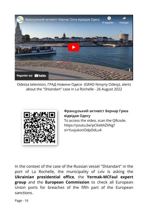 Odessa television, ГРАД Новини Одеси ️ (GRAD Novyny Odesy), alerts about the « Shtandart » case in La Rochelle – 26 August 2022