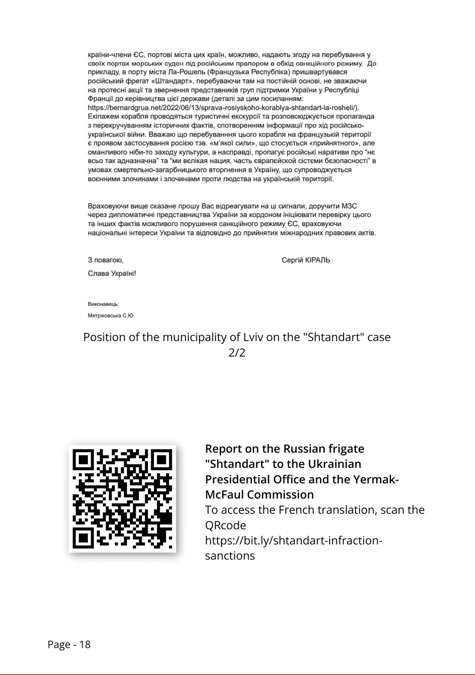 In the context of the case of the Russian vessel « Shtandart » in the port of La Rochelle, the municipality of Lviv is asking the Ukrainian presidential office, the Yermak-MCFaul expert group and the European Commission to check all European Union ports for breaches of the fifth package of the European sanctions.