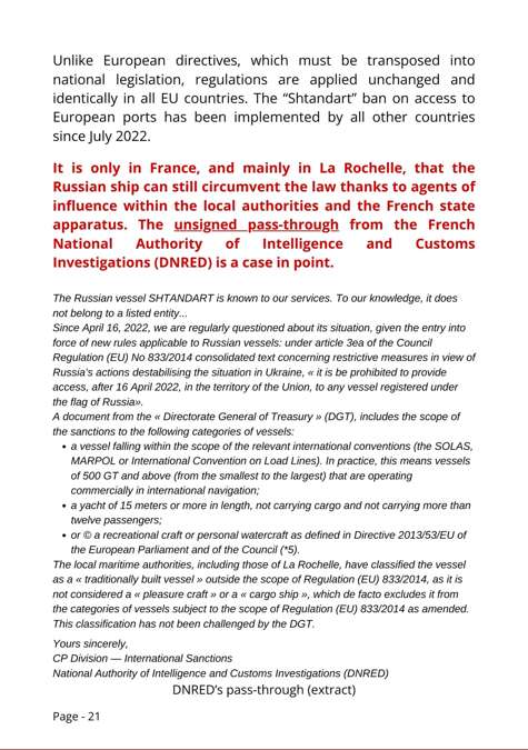 It is only in France, and mainly in La Rochelle, that the Russian ship can still circumvent the law thanks to agents of influence within the local authorities and the French state apparatus. The unsigned pass-through from the French National Authority of Intelligence and Customs Investigations (DNRED) is a case in point.