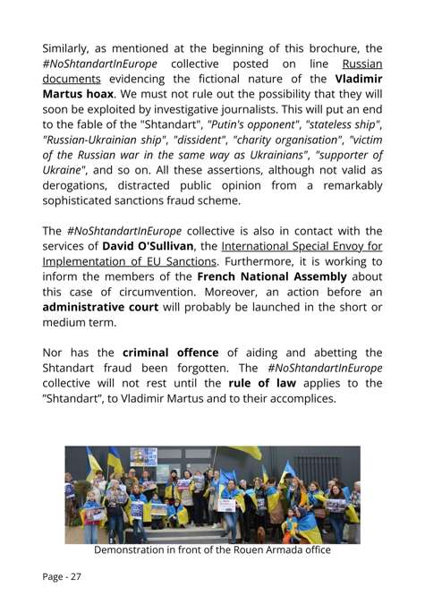 The #NoShtandartInEurope collective is also in contact with the services of David O’Sullivan, the International Special Envoy for Implementation of EU Sanctions. Furthermore, it is working to inform the members of the French National Assembly about this case of circumvention. Moreover, an action before an administrative court will probably be launched in the short or medium term.