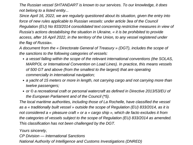 Un règlement européen n’est pas une directive. Sa mise en œuvre ne nécessite pas de législations nationales. Il s’applique, de façon identique, sans modification, dans tous les États de l’UE. Néanmoins, depuis juillet 2022, la France est le seul pays européen, n’appliquant pas, au « Shtandart », le règlement n°833/2014.