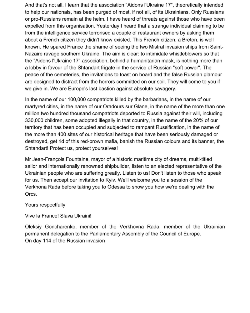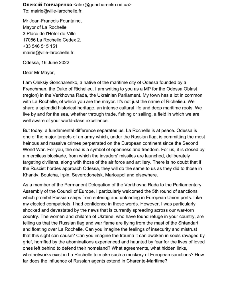 Oleksiy Goncharenko to Jean-François Fountaine 1/2Oleksiy Goncharenko to Jean-François Fountaine 2/2Oleksiy Goncharenko’s letter to Jean-François Fountaine, mayor of La Rochelle (translated from French)
