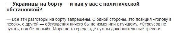 Lorsqu’en 2014 la Russie a annexé la Crimée et lancé sa guerre dans le Donbass (14 000 morts et deux millions de personnes déplacées), Vladimir Martus a interdit d’en parler à bord du Shtandart. Il s’en est exprimé très clairement, en russe, sur Novaïa Gazeta le 10 septembre 2014.
