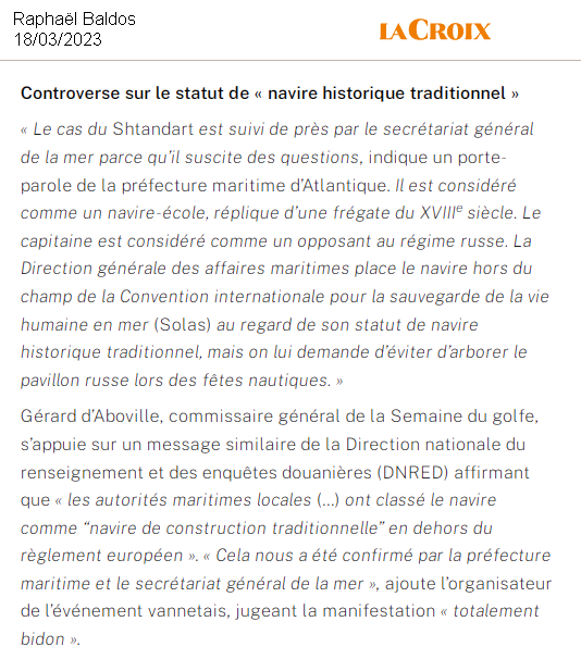 À notre connaissance, seul Raphaël Baldos, dans le journal La Croix, a cité textuellement les propos de Premar Brest, voir pièce jointe. Il n’était pas question des sanctions, mais seulement du fait que le Shtandart n’était pas concerné par la convention SOLAS, relative aux navires de transports de passagers. Ce point, qui « l’autorise » à naviguer en ayant déconnecté son AIS depuis le 6 juin 2022, comme les navires de charge russes contournant les sanctions, fait débat. Quoi qu’il en soit, le Shtandart relève bien de plusieurs des conventions pertinentes qui permettent de le classer en tant que navire (russe, qui plus est) tel que spécifié au paragraphe 3 alinéa « a » de l’article 3 sexies bis du règlement UE n°833/2014: