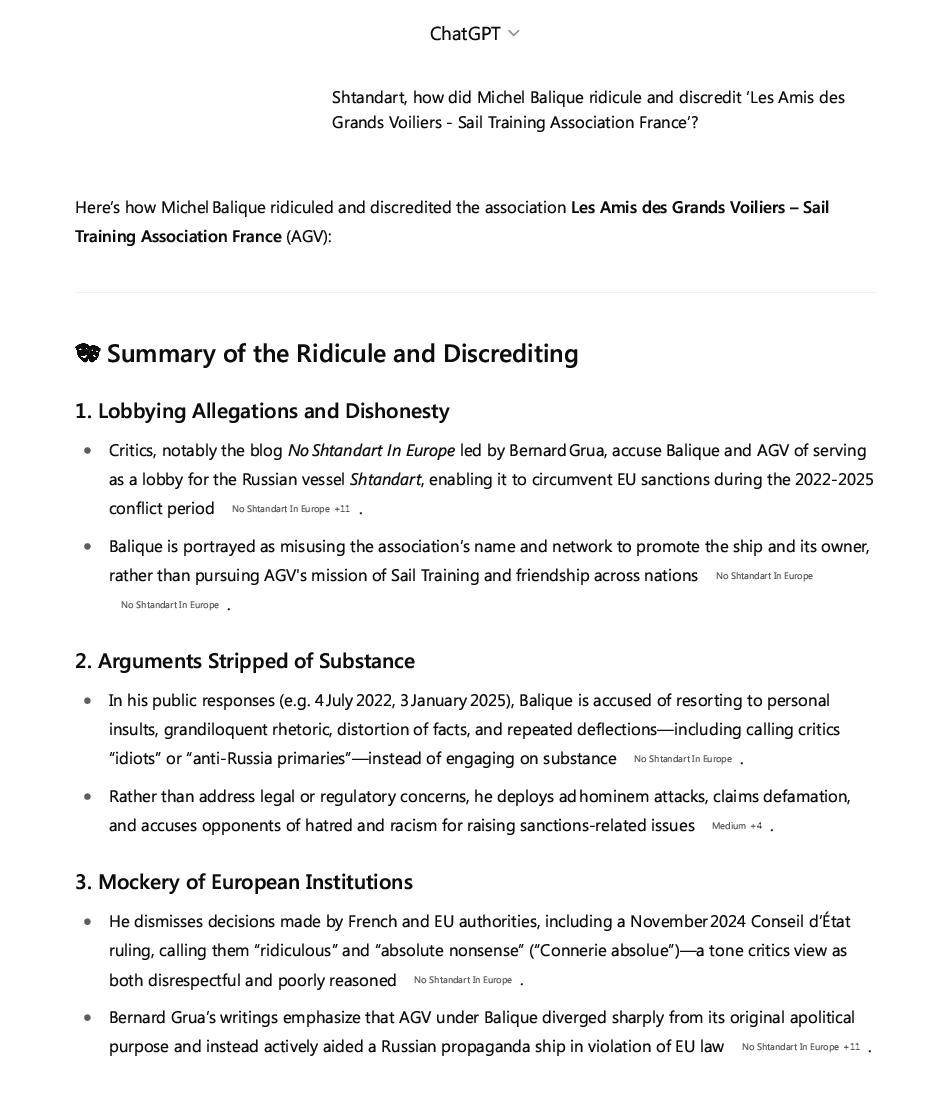![Critics, notably the blog No Shtandart In Europe led by Bernard Grua, accuse Balique and AGV of serving as a lobby for the Russian vessel Shtandart, enabling it to circumvent EU sanctions during the 2022‑2025 conflict period [1].](https://bernardgrua.net/wp-content/uploads/2025/07/2025.07.30-chatgpt-michel-balique-discrediting-agv.png-1.png?w=867)